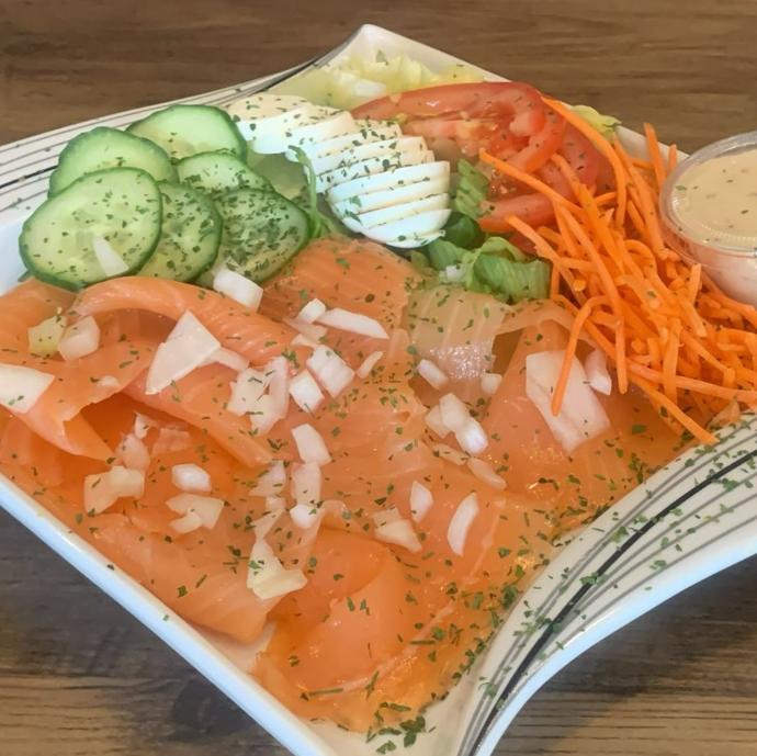 Saumon Fumé, Salade, Tomates, Concombre, Carotte, Oignon frais, Maïs, œuf, Vinaigrette