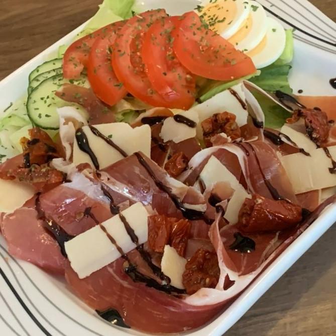 Jambon de Parme, Salade, Tomates séchée, Tomates, Parmesan, crème Balsamique