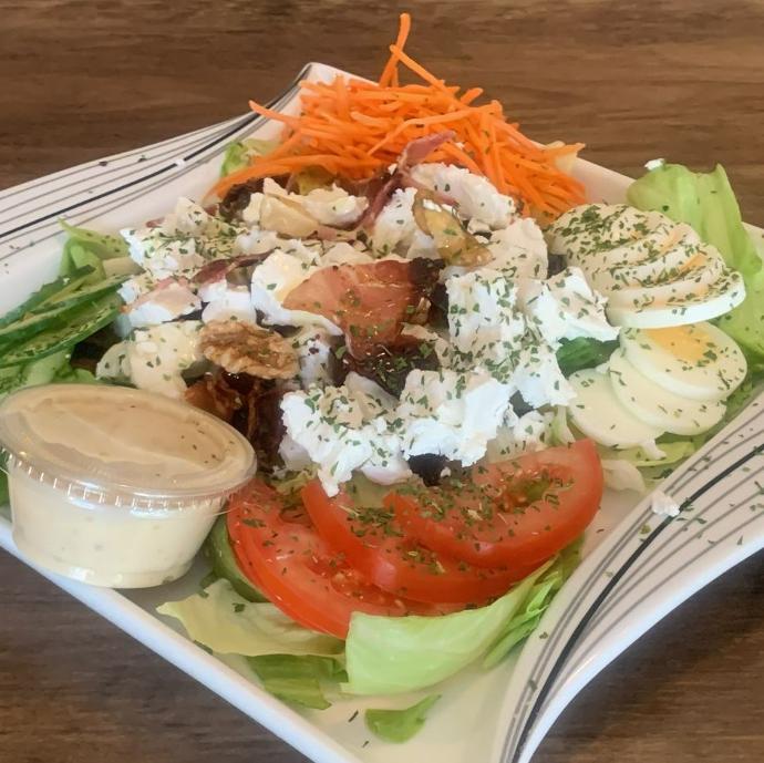 Américain, Salade, Tomates, Concombre, Maïs, œuf, Cornichon, Oignons frais, Vinaigrette, épices