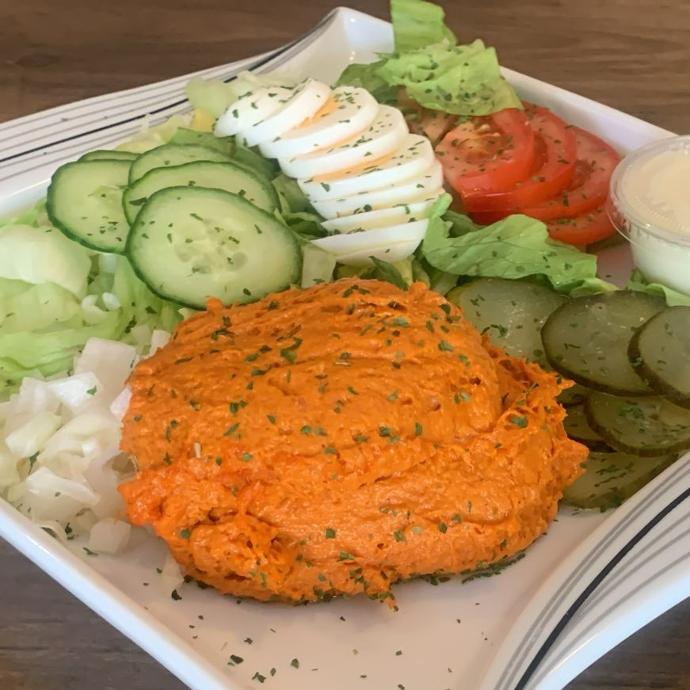 Saumon Fumé, Salade, Tomates, Concombre, Carotte, Oignon frais, Maïs, œuf, Vinaigrette